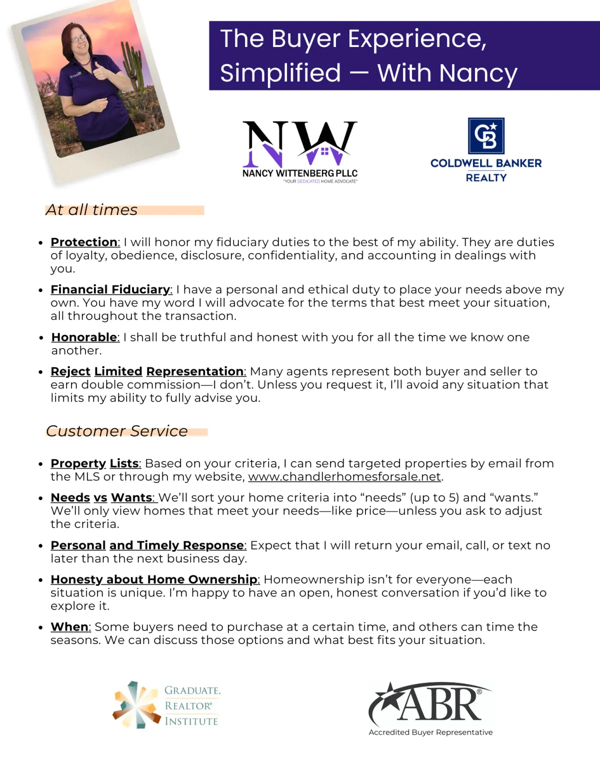 As an area expert, Nancy can help educate you on the unique characteristics of cities, such as Chandler, different neighborhoods, schools, and other local community amenities that suit your lifestyle.